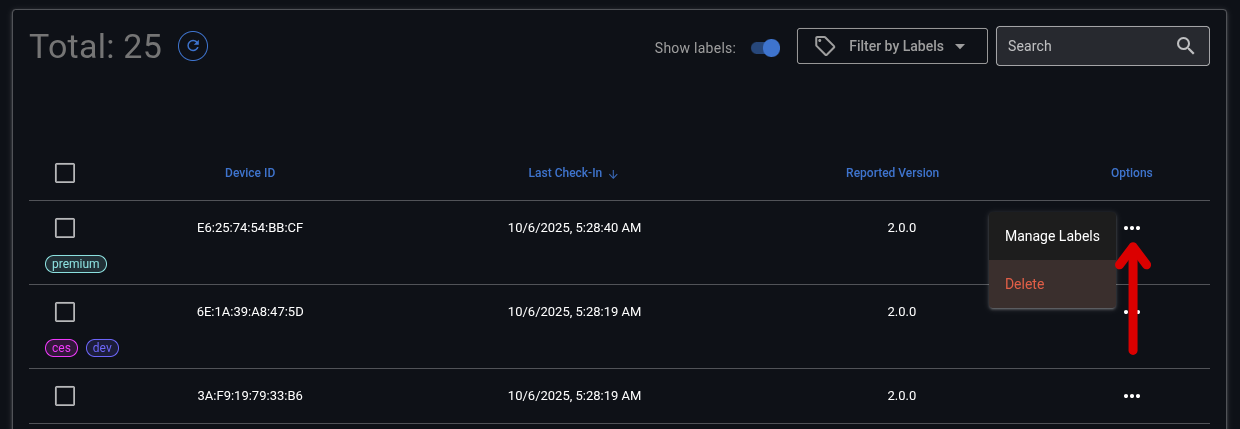 - Click Manage Labels from the bulk edit toolbar that appears above the device list